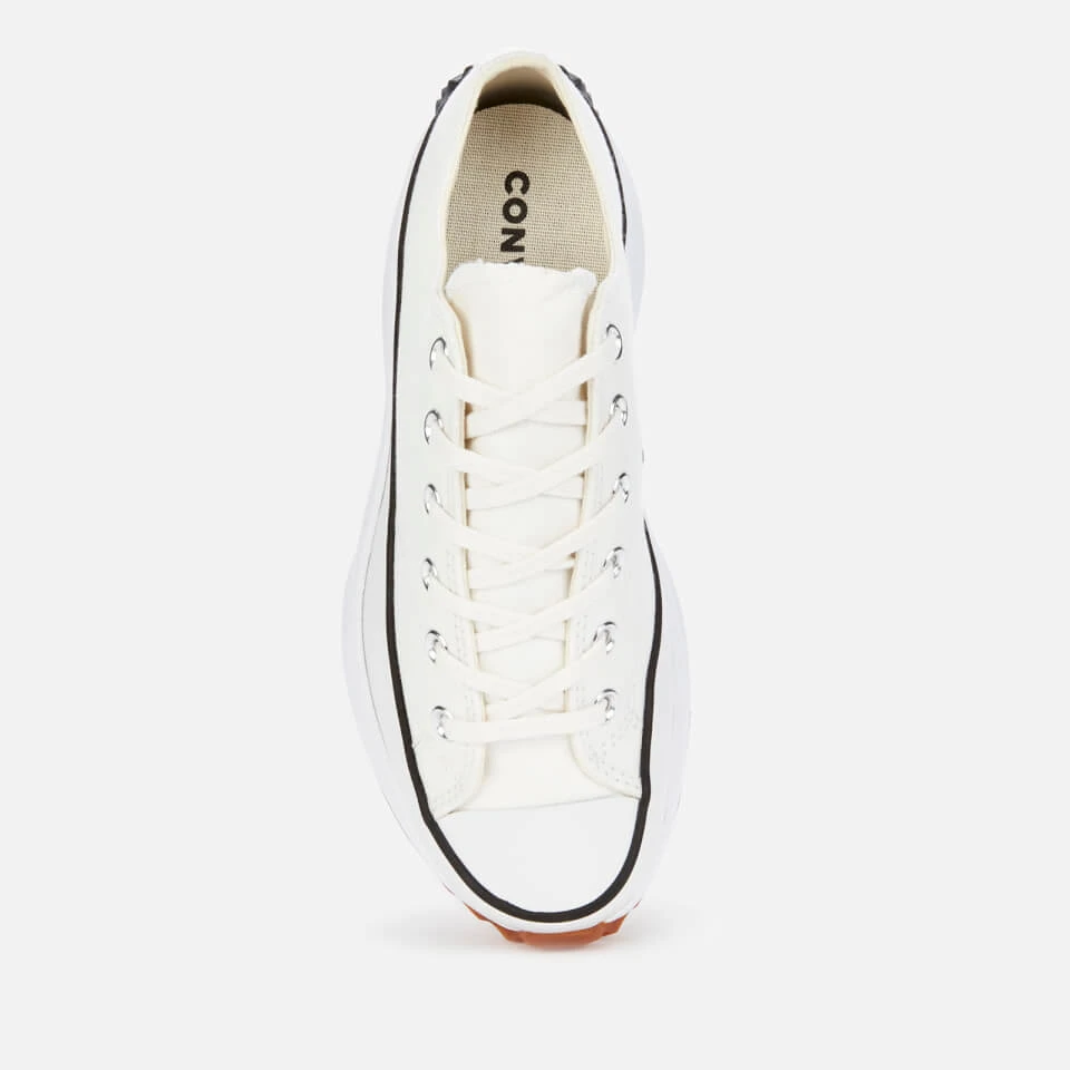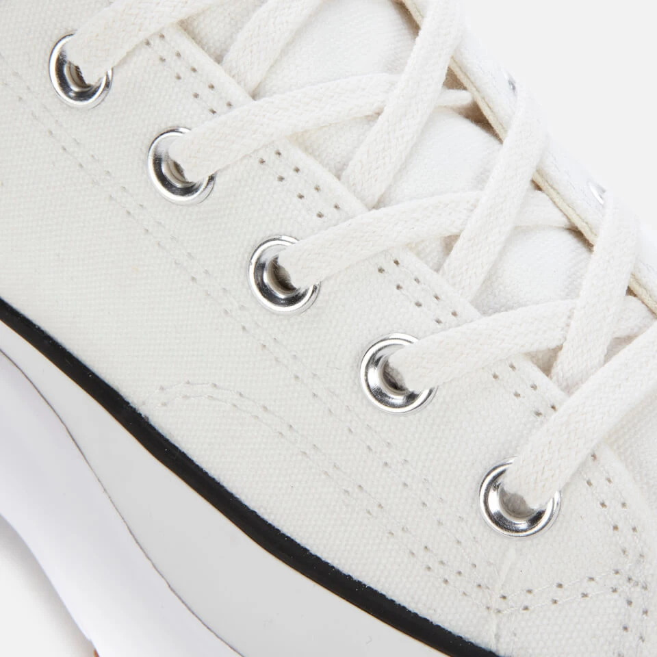 Built upon a tri-toned sole with serrated treading for enhanced grip, the sneakers feature durable canvas uppers in and off-white colourway. Fastened with a six-eyelet lacing system, the flatform trainers are detailed with a black heel overlay that extends from the outsole to the ankle. Finishing touches include an oversized star appliqué at the heel, breathable eyelets at the inner foot, and fraying along the edges of the tongue. Complete with branded insoles.