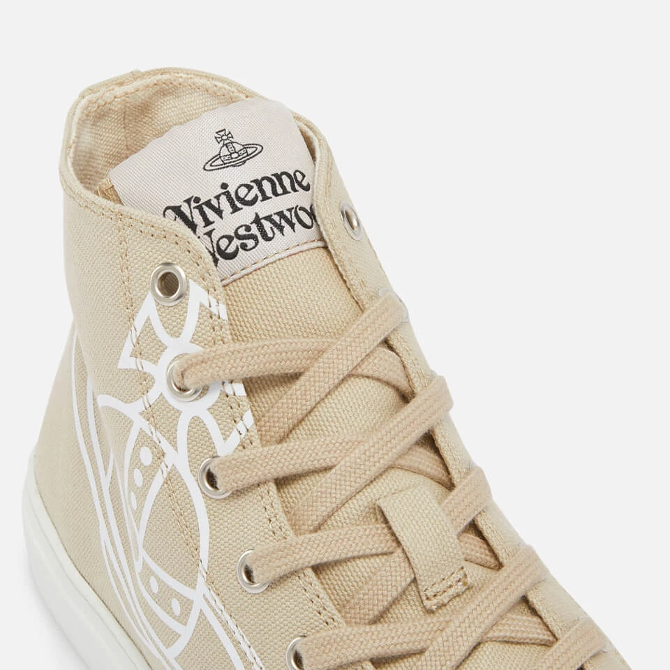 Vivienne Westwood’s hi-top trainers offer a minimalistic design with the iconic Orb logo on the side. They’re made from beige canvas and feature statement designer on the tongue. Wear them with a matching-coloured trousers and a plain T-Shirt.